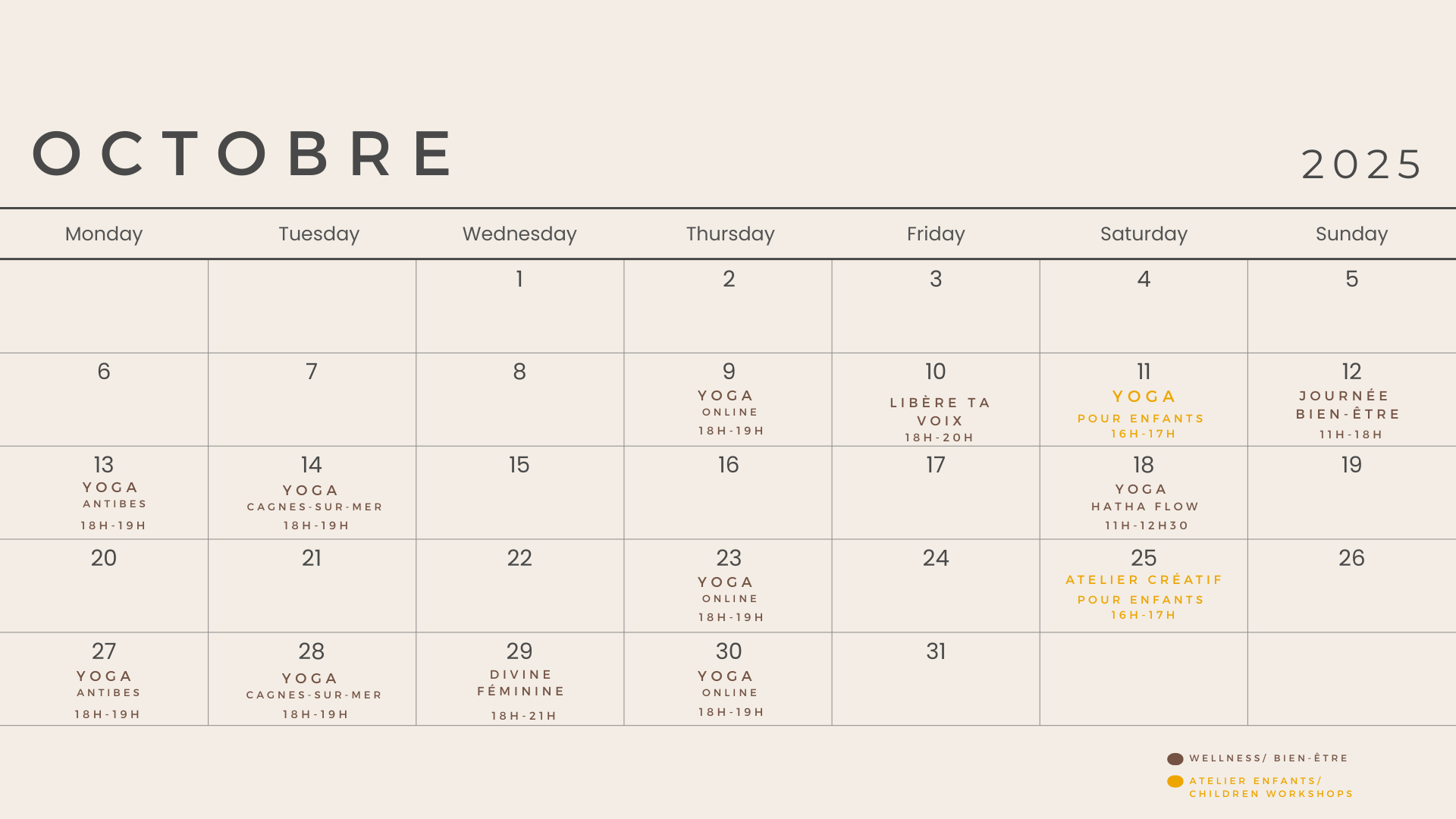 A journey through the elements (earth, fire, water, air) blending Hatha and Vinyasa, inspired by her 200-hour training at PachaMama, Costa Rica. Reconnect with yourself, with nature, and with the body’s wisdom in a peaceful setting — on the beach in Antibes.A gentle yet deep practice to release, transform, and harmonize.